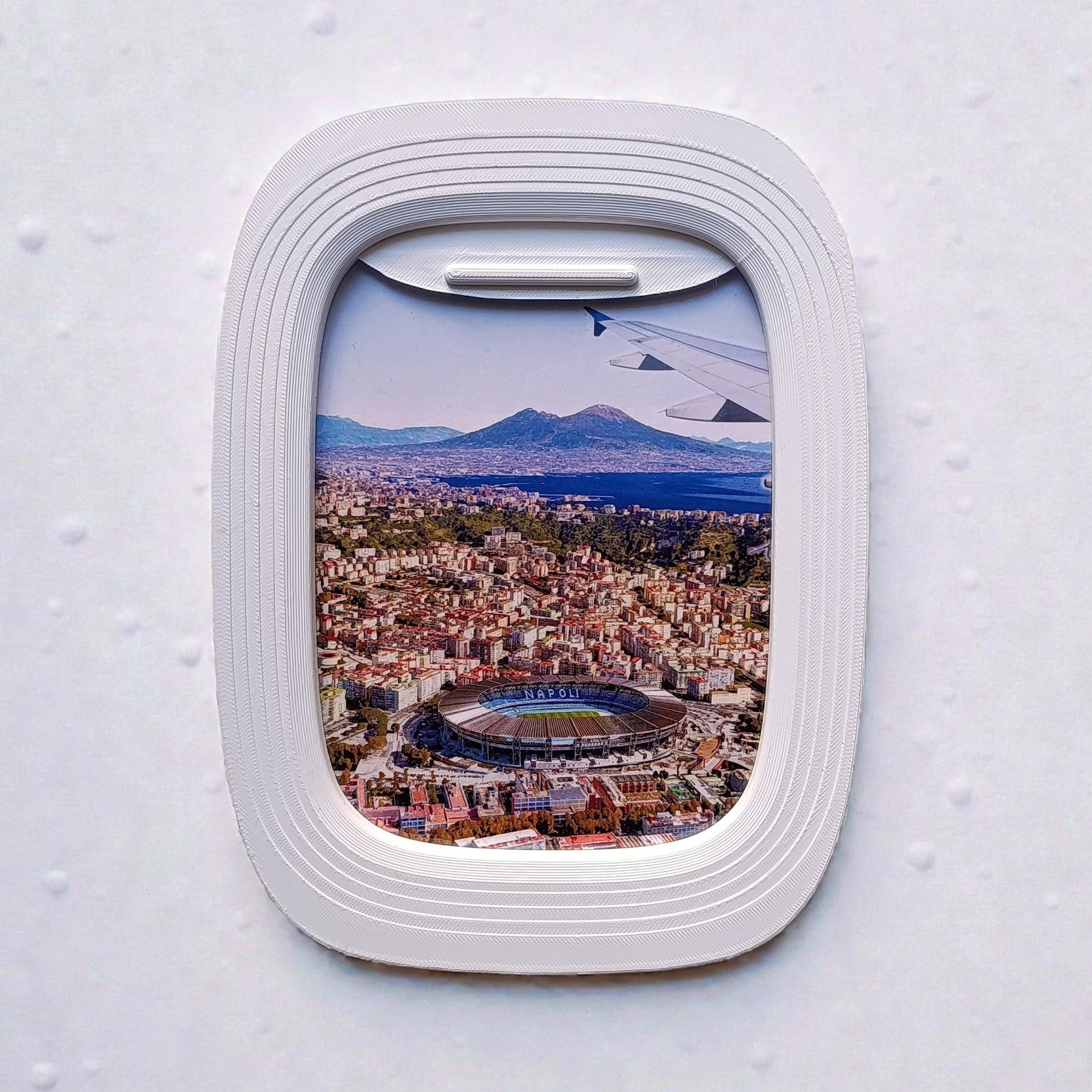 Abbiamo racchiuso quell’emozione in un oggetto di design unico. Una cornice stampata in 3D a forma di oblò che incornicia il panorama più bello del mondo: il Vesuvio che abbraccia la città e il "Tempio" che brilla dall'alto.